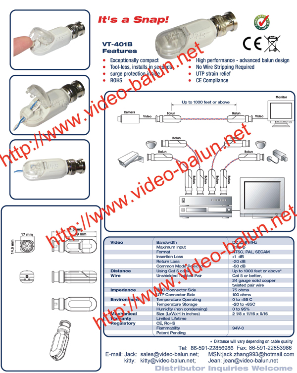 VT-401J is a BNC balun (peredacha signalov po vitoi pare) for CCTV CAT-5 Twisted Pair Transmission at a distance up to 300 METERS from a CCTV camera to a recorder or other video input device,